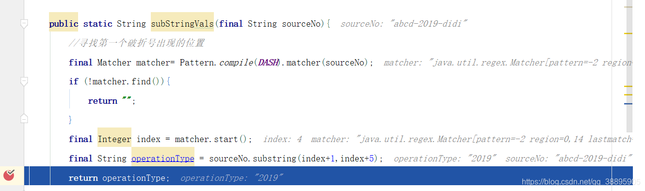 public class PatternMatchUtils { private static final String DASH = "-2"; public static String subStringVals(final String sourceNo){ //寻找第一个破折号出现的位置 final Matcher matcher= Pattern.compile(DASH).matcher(sourceNo); if (!matcher.find()){ return ""; } final Integer index = matcher.start(); final String operationType = sourceNo.substring(index+1,index+5); return operationType; }} 匹配第一个出现的 “-”并截取后四位